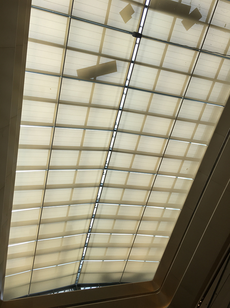 采光頂及大面積玻璃在發(fā)生通透性、天然采光的一起,也需求裝備相應(yīng)的遮陽設(shè)施才干保障商場內(nèi)光線及溫度的舒適性,節(jié)省空調(diào)能耗。